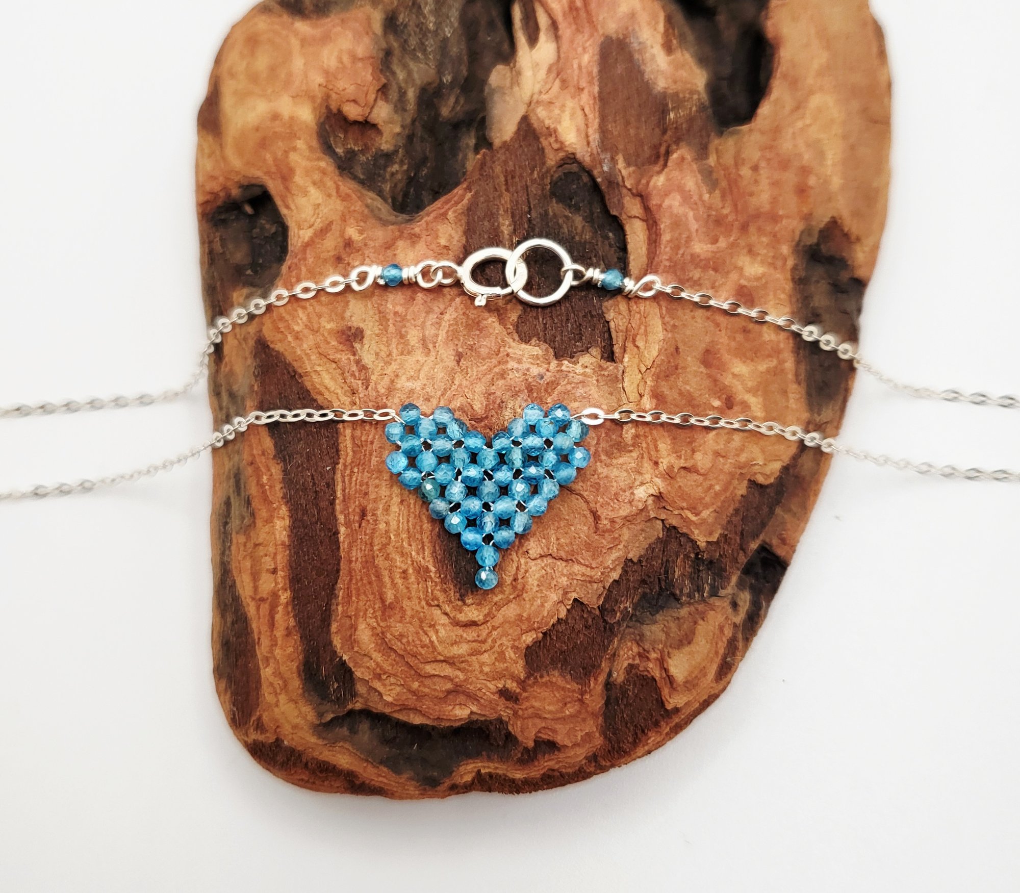 This beautiful hand woven Apatite -tiny- heart is a stone of service, of teaching, and of communication. It may help one to develop clairvoyance, clairaudience, and clairsentience. It is one of the smallest hearts that I weave!