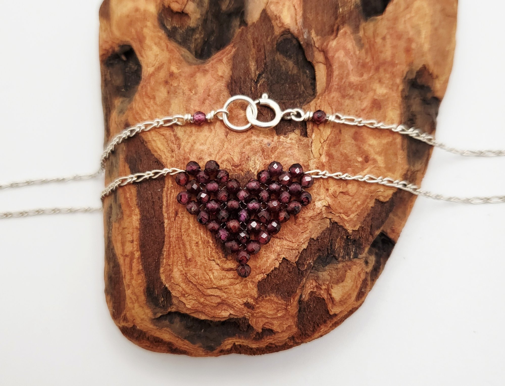 This beautiful hand woven Red Garnet heart is a stone of commitment and devotion. It can inspire love, warmth, and understanding.